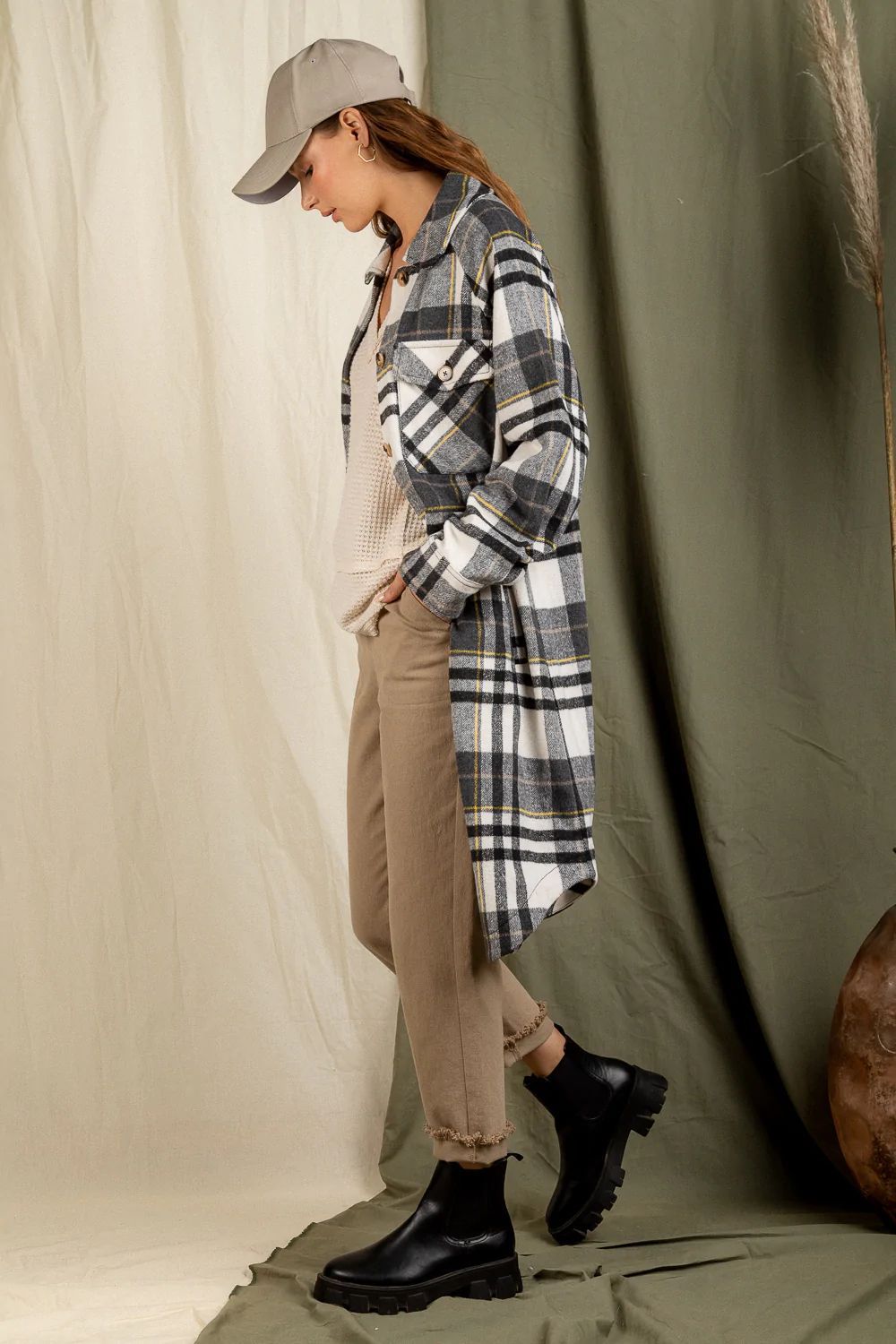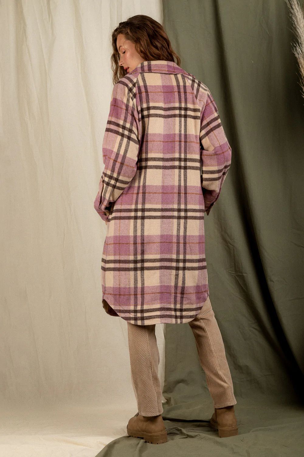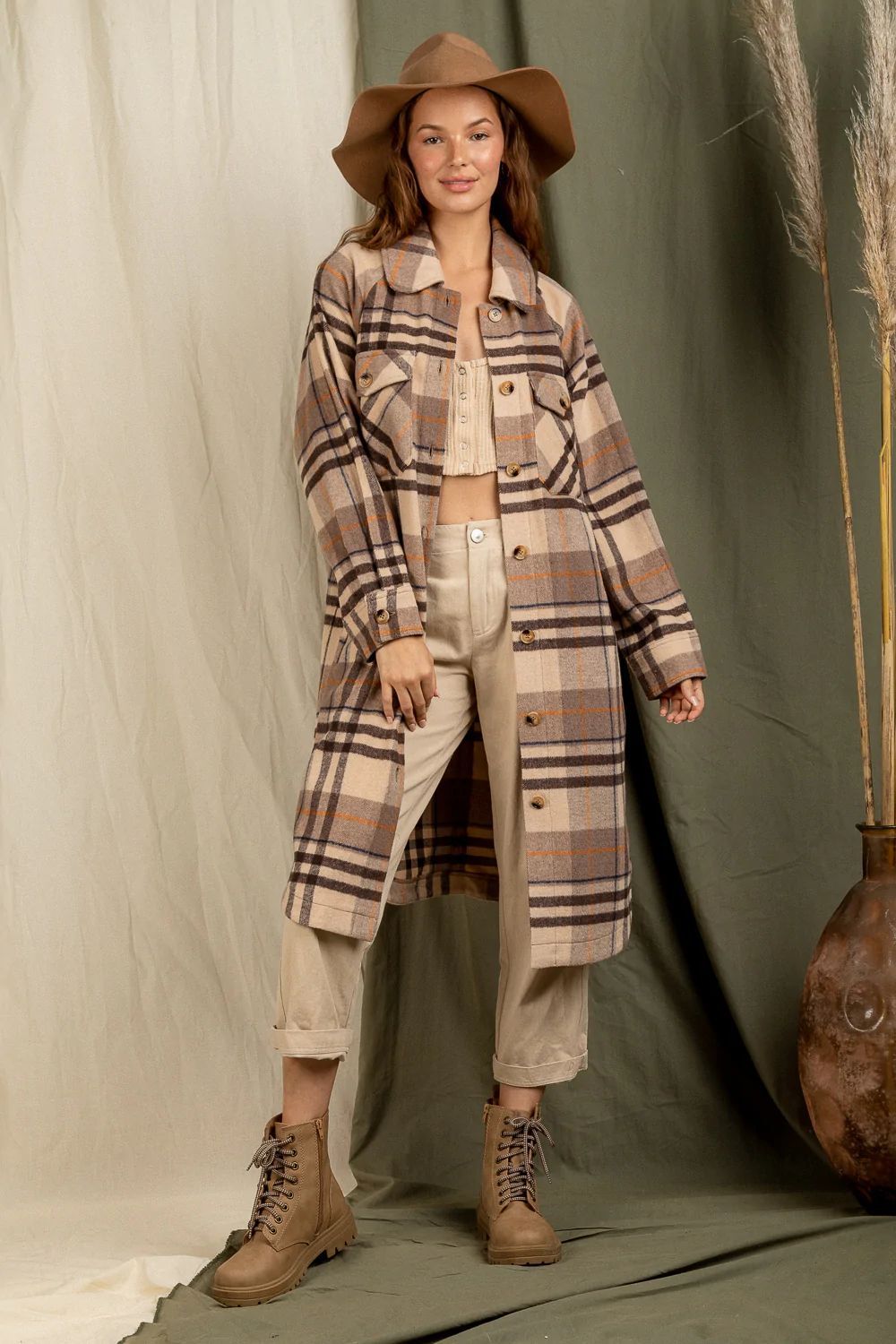 Checkered Lapel Pocket Long Coat