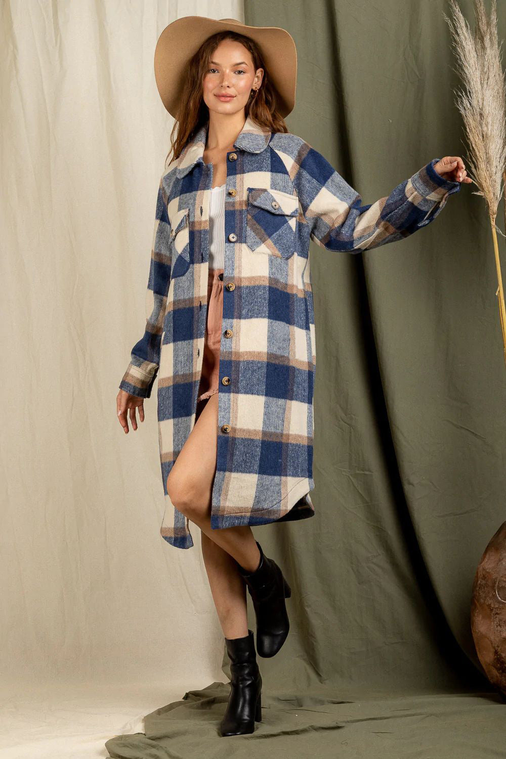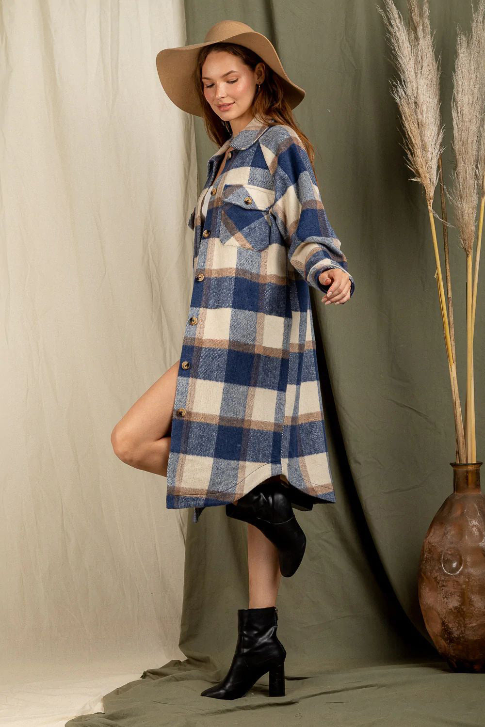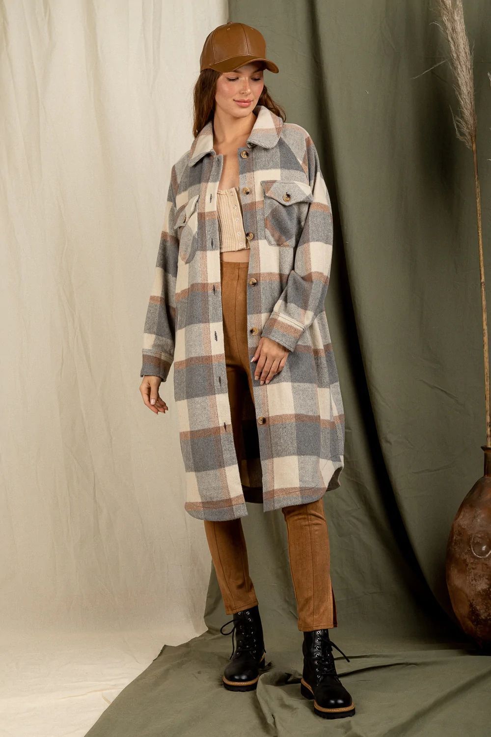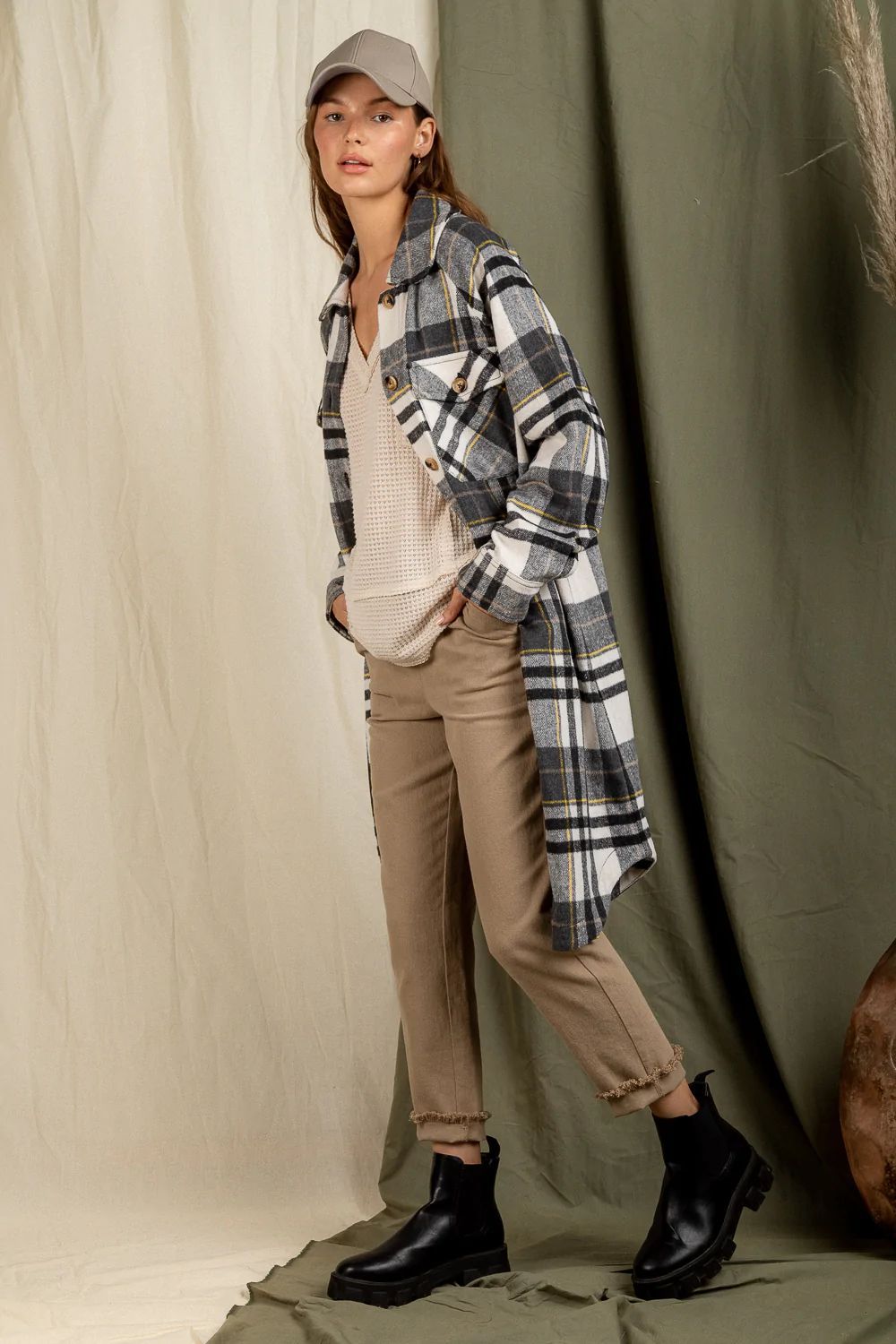 Checkered Lapel Pocket Long Coat
