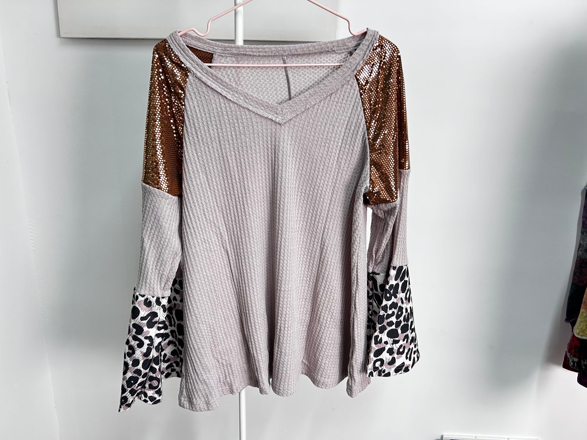 Leopard Sequin Patchwork Bell Sleeve Tunic Top