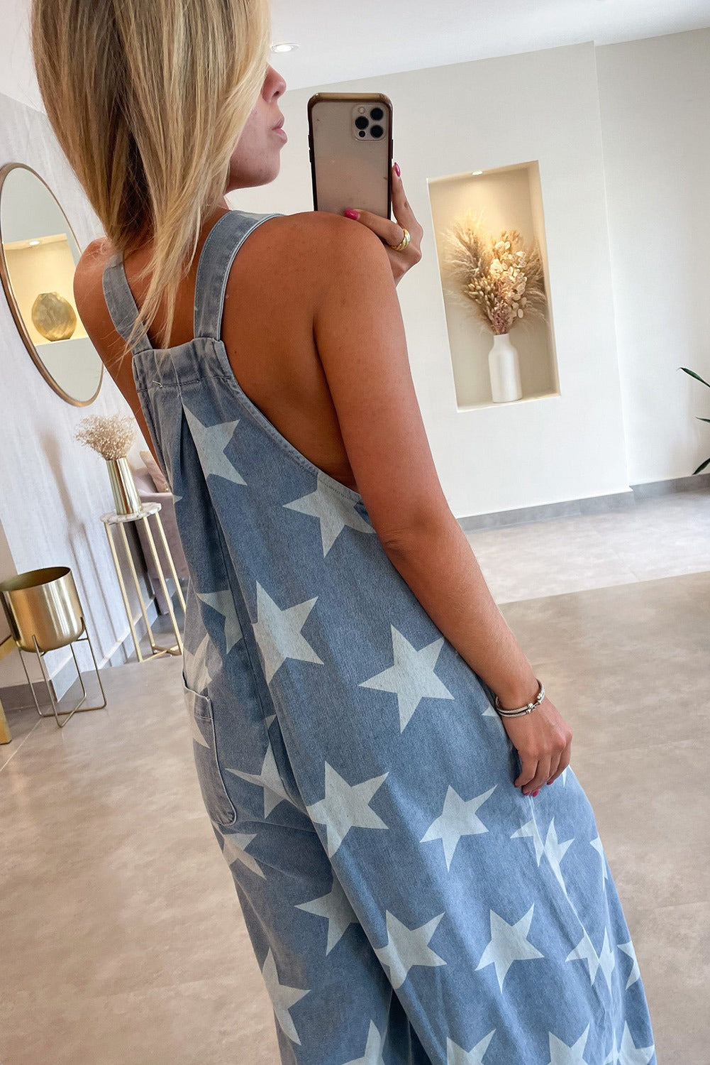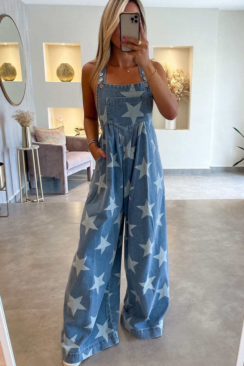 Star Buttoned Strap Pleat Wide Leg Denim Overall