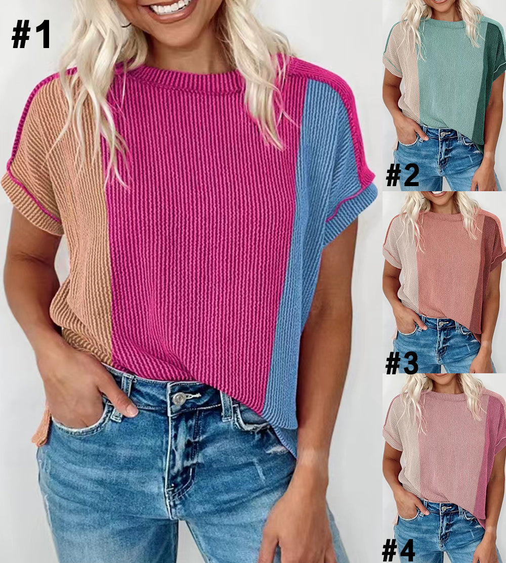 Ribbed Contrast Trim Round Neck T Shirt